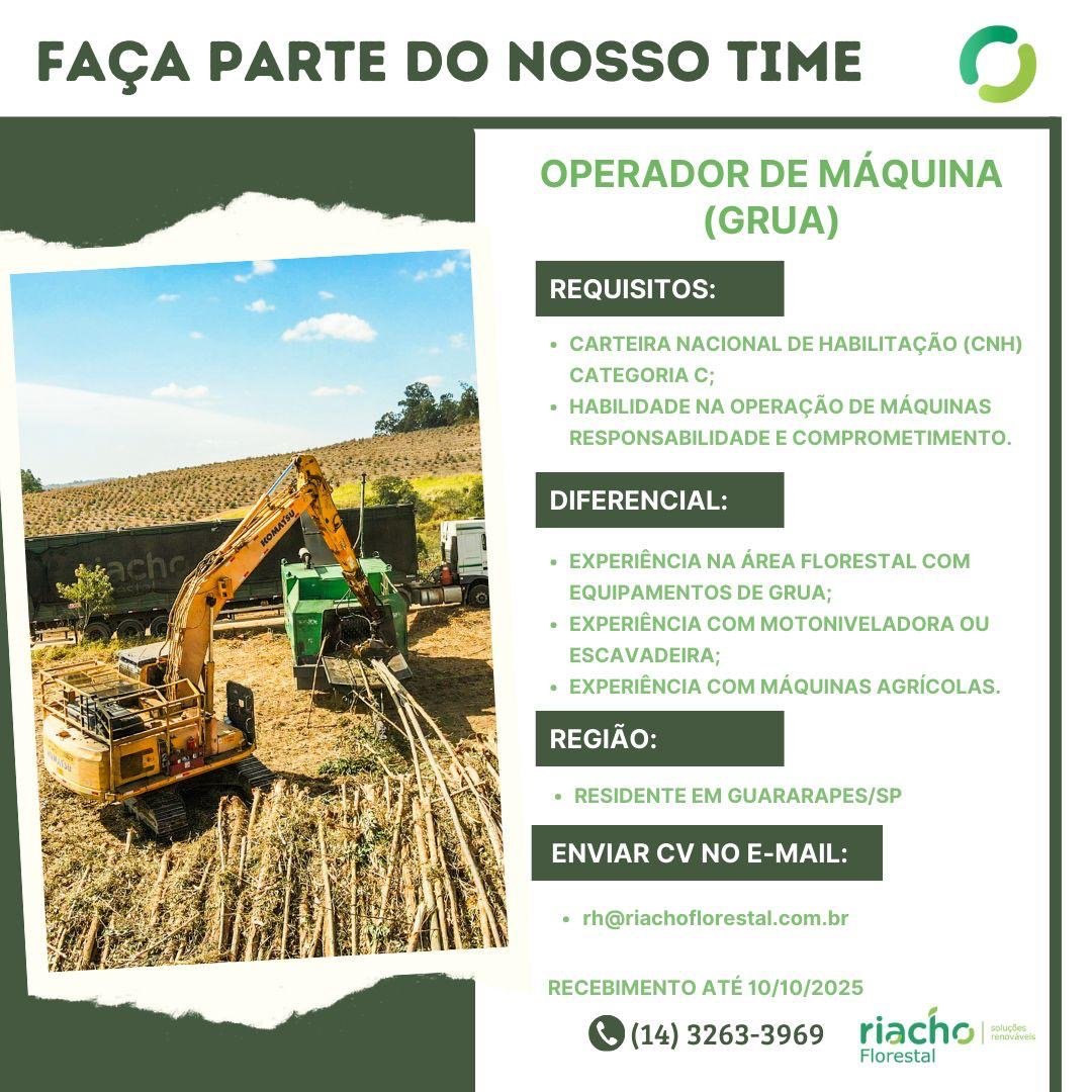 Vaga Operador de Máquina (Grua) - Riacho Florestal Vaga: Operador de Máquina (Grua) Empresa: Riacho…