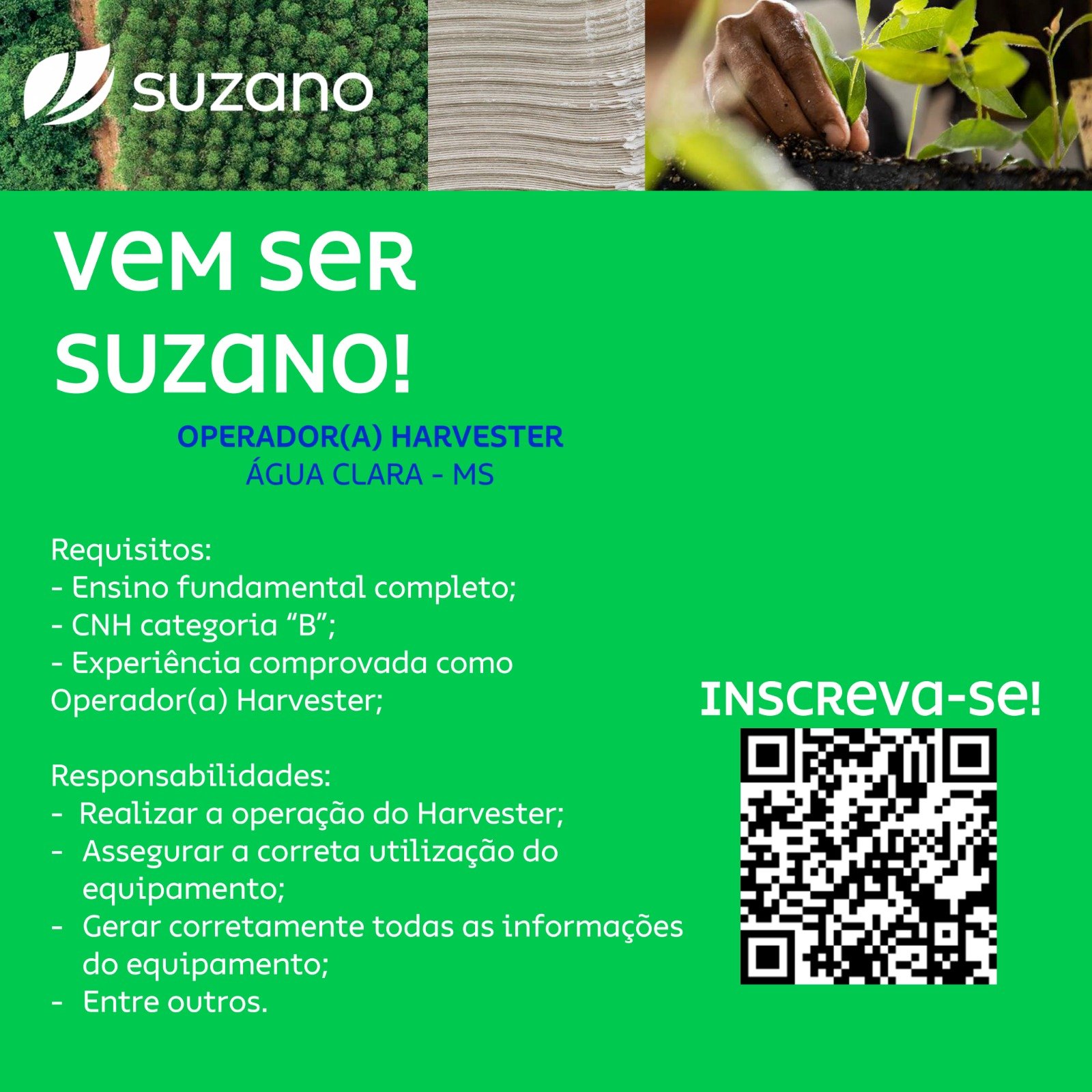 - Suzano abre vagas para Operador de Harvester